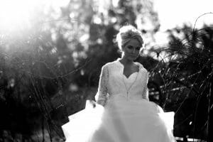 black and white bridal portrait with sun flair at Stonehurst Cedar Creek